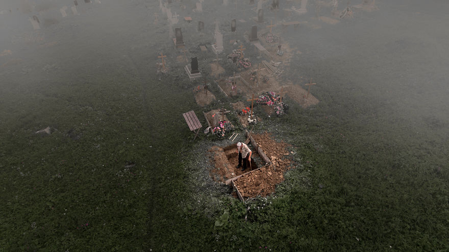 Πρωινό με ομίχλη στην Ουκρανία, όπου ο φωτογράφος ανακάλυψε έναν άντρα να σκάβει έναν τάφο με τα γυμνά χέρια του σε ένα μικρό νεκροταφείο.