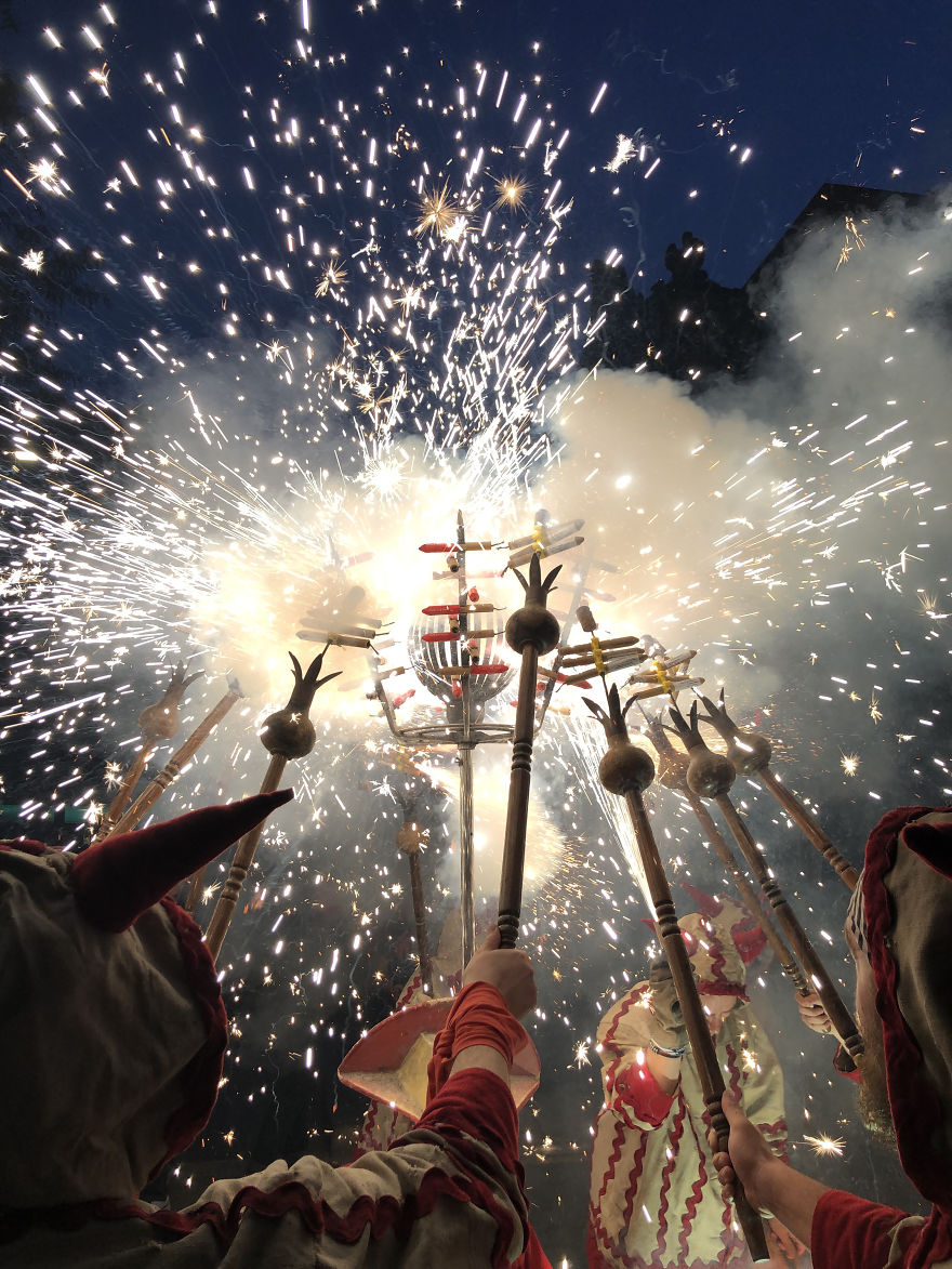 Πυροτεχνήματα κατά τη διάρκεια ενός παραδοσιακού καταλανικού φεστιβάλ, όπου ομάδες ντυμένοι ως διάβολοι ανάβουν πυροτεχνήματα στο πλήθος.