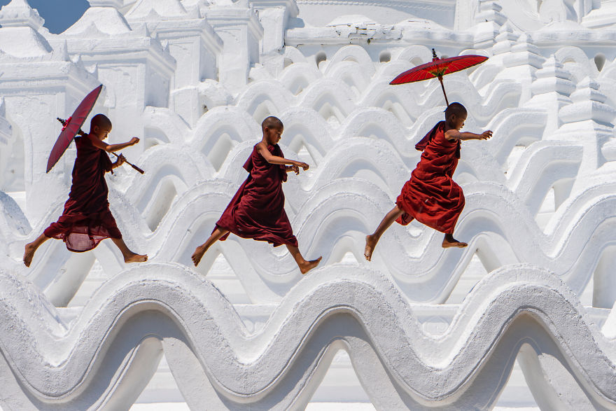 Νέοι μοναχοί που διασκεδάζουν στο Hsinbyume Pagoda.