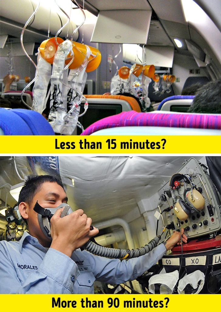 Οι μάσκες οξυγόνου μπορούν να λειτουργήσουν για 10-15 λεπτά. Είναι αρκετός χρόνος για τον πιλότο να κατεβάσει το αεροπλάνο σε υψόμετρο όπου μπορείτε να αναπνέετε κανονικά. Οι πιλότοι έχουν τις δικές τους μάσκες οξυγόνου που λειτουργούν για μεγαλύτερο χρονικό διάστημα. Αυτό συμβαίνει επειδή πρέπει να είναι σε θέση να προσγειωσούν στο αεροπλάνο χωρίς να χάσουν την εστίασή τους. Πριν από κάθε πτήση, οι πιλότοι τσεκάρουν αν οι μάσκες τους λειτουργούν σωστά.