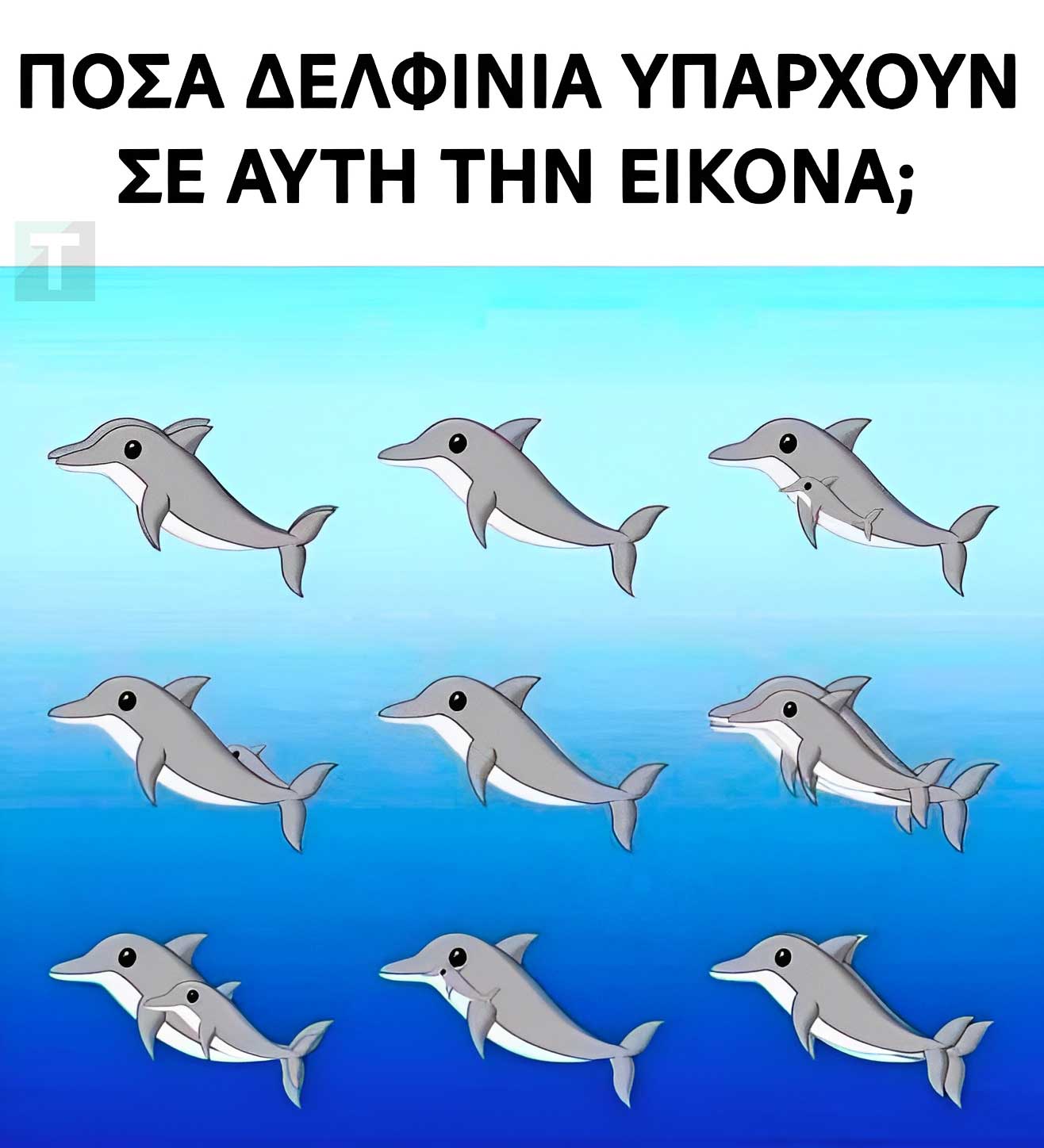 Ο καθένας έχει τον δικό του αριθμό. Μπορείτε και εσείς να προσπαθήσετε να βρείτε όλα τα δελφίνια. Όλοι θα συμφωνήσουν με εννέα δελφίνια. Αλλά υπάρχουν περισσότερα από αυτά.