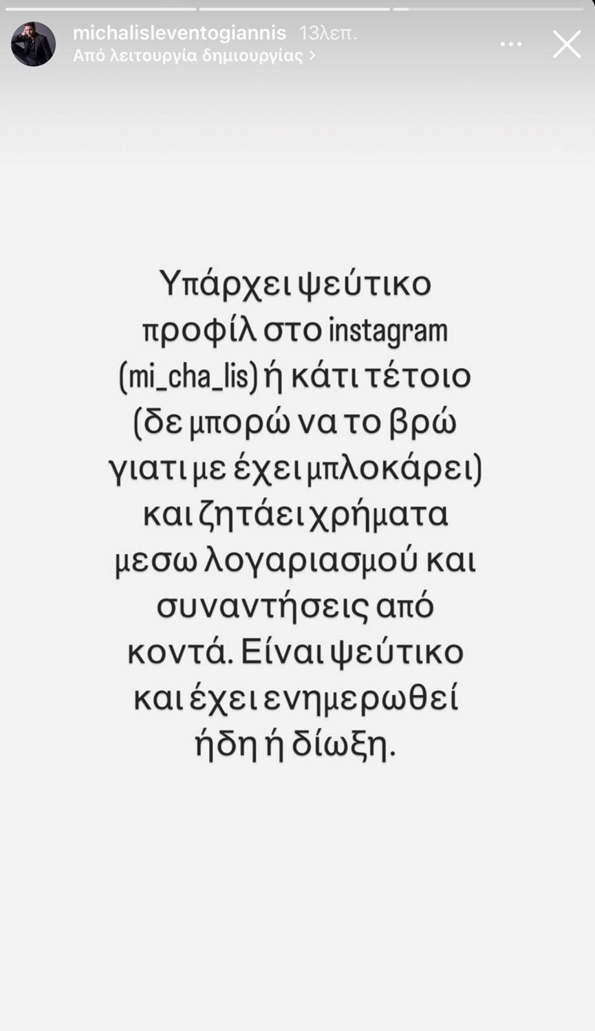 Στην ανάρτησή του μέσω Instagram story, ο Μιχάλης Λεβεντογιάννης εξέφρασε την προειδοποίησή του προς τους διαδικτυακούς του φίλους, λέγοντας: «Υπάρχει ψεύτικο προφίλ στο Instagram (mi_cha_lis) ή κάτι τέτοιο δεν μπορώ να το βρω γιατί με έχει μπλοκάρει και ζητάει χρήματα μέσω λογαριασμού και συναντήσεις από κοντά, είναι ψεύτικο και έχει ενημερωθεί η δίωξη».