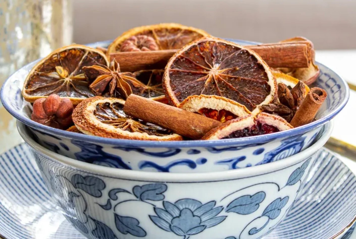 Συνδυάστε αποξηραμένες φλούδες πορτοκαλιού με λουλούδια, βότανα και μπαχαρικά (π.χ. λεβάντα, δεντρολίβανο, ξυλάκι κανέλας). Τοποθετήστε το μείγμα σε μπολ ή πουγκιά για άρωμα και διακόσμηση.