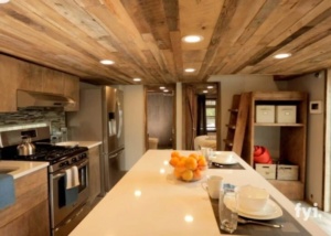 Το ταβάνι είναι και αυτό από ξύλο, η κουζίνα είναι άψογα σχεδιασμένη για να έχει χώρο για έναν κανονικό φούρνο, νεροχύτη, ψυγείο και τραπεζαρία.