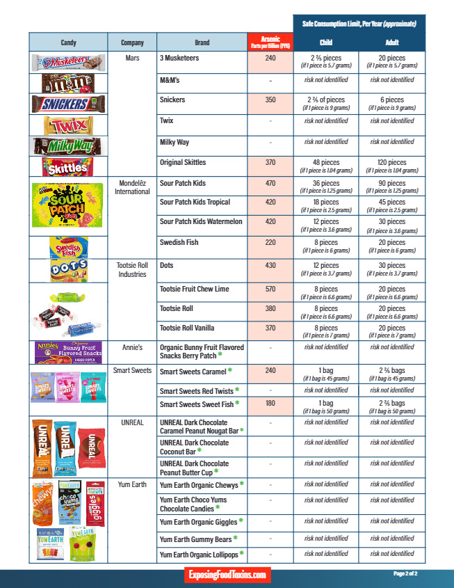 • Sour Patch Kids: 470 ppb, ασφαλές όριο 36 τεμάχια ετησίως για παιδιά και 90 για ενήλικες. • Sour Patch Kids Tropical: 420 ppb, ασφαλές όριο 18 τεμάχια για παιδιά και 45 για ενήλικες. • Sour Patch Kids Watermelon: 420 ppb, ασφαλές όριο 12 τεμάχια ετησίως για παιδιά και 30 για ενήλικες. • Swedish Fish: 220 ppb, ασφαλές όριο 8 τεμάχια για παιδιά και 20 για ενήλικες.