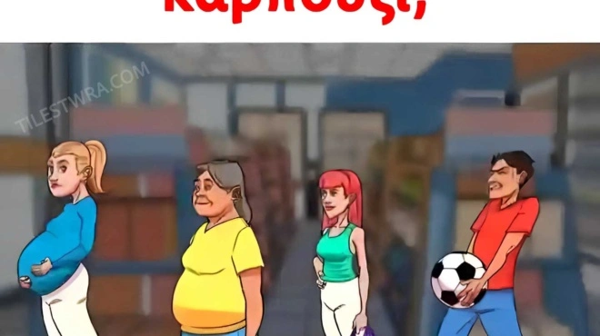 Η εικόνα απεικονίζει μια έγκυο γυναίκα, μια ηλικιωμένη κυρία με μια κόκκινη τσάντα, μια νεαρή γυναίκα με μια βιολετί τσάντα και έναν άνδρα που κρατά μια μπάλα ποδοσφαίρου. Για να βρείτε τον κλέφτη, χωρίστε την εικόνα σε φανταστικά τμήματα για να βεβαιωθείτε ότι δεν θα χάσετε κανένα στοιχείο ή υπόδειξη.