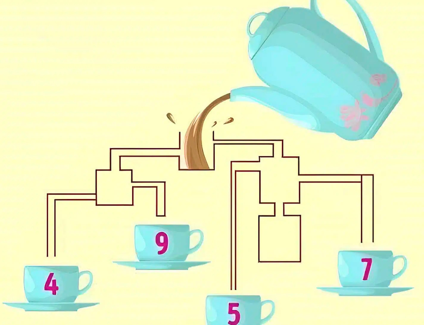 Η παρακάτω εικόνα δείχνει έναν λαβύρινθο από σωλήνες και δεξαμενές νερού και σας ζητείται να υπολογίσετε ποιο φλιτζάνι θα γεμίσει πρώτο με τσάι . Ωστόσο δεν έχετε πολύ χρόνο. Πρέπει να βρείτε την απάντηση σε μόλις 5 δευτερόλεπτα.
