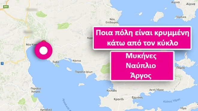 Στο παρακάτω τεστ καλείσαι ν’ απαντήσεις ποια πόλη βρίσκεται στο κέντρο του κύκλου που έχει επισημανθεί στον χάρτη.