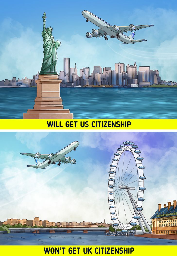 Οι άλλες 2 δυνατότητες είναι ότι το μωρό θα λάβει την ιθαγένεια της χώρας στην οποία είναι εγγεγραμμένο το αεροσκάφος ή όπου βρίσκεται το αεροπλάνο κατά τη στιγμή της παράδοσης. Για παράδειγμα, εάν ένα μωρό γεννιέται σε οποιοδήποτε μέρος της επικράτειας των ΗΠΑ, ακόμη και στον αέρα, θα λάβει αμέσως την υπηκοότητα των ΗΠΑ. Αλλά εάν ένα μωρό γεννιέται στον βρετανικό εναέριο χώρο, δεν θα λάβει Βρετανική υπηκοότητα.