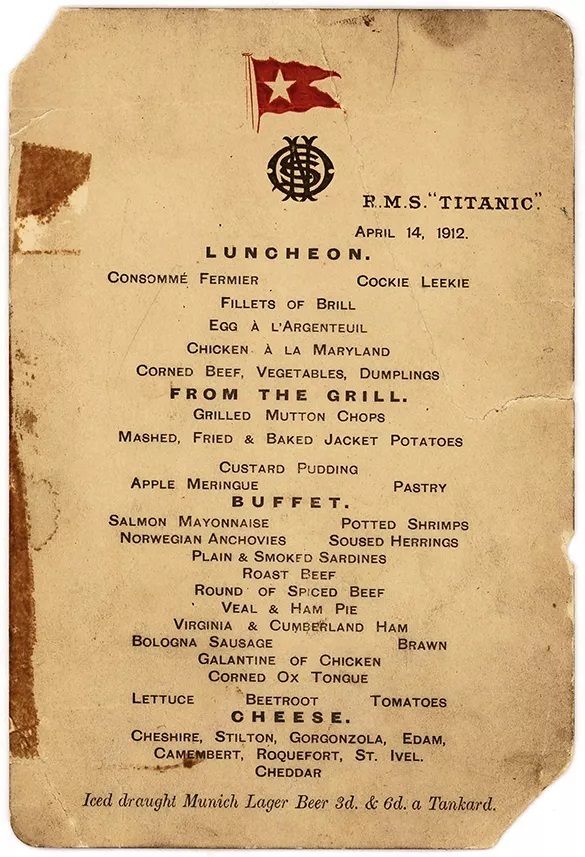 Στις 14 Απριλίου 1912, λίγες ώρες πριν τη μοιραία σύγκρουση με το παγόβουνο που θα έμενε στην Ιστορία, οι επιβάτες στο υπερωκεάνειο «Τιτανικός» απόλαυσαν το μεσημεριανό τους γεύμα χωρίς να γνωρίζουν ότι θα ήταν το τελευταίο.