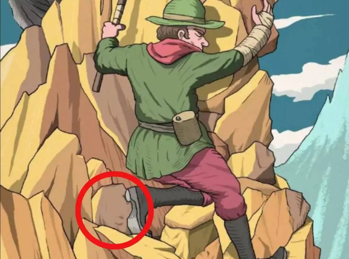 Το πρόσωπο του άνδρα κρύβεται κοντά στο αριστερό πόδι του ορειβάτη. Στην πραγματικότητα σχηματίζεται μέσα από το παπούτσι και τις σχισμές ενός βράχου.