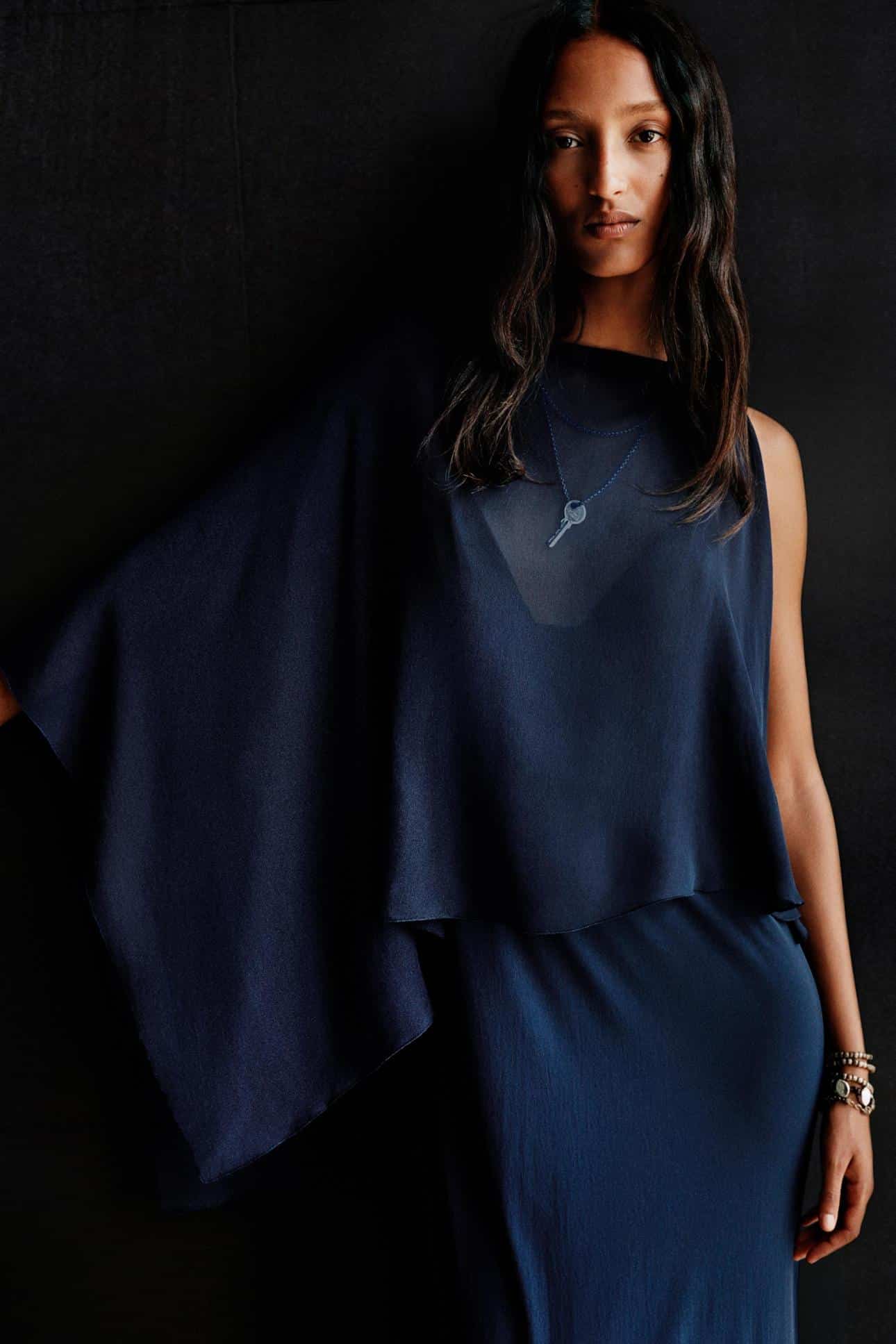 Το ασύμμετρο ύφασμα τύπου κάπα και οι πιέτες στο στήθος χαρίζουν διακριτική κίνηση και χαρίζουν επιπλέον στιλ, ενώ το V ντεκολτέ αναδεικνύει τη γραμμή του λαιμού και των ώμων με κομψό τρόπο. Η λεπτομέρεια στο ύφασμα και η ροή του φορέματος επιτρέπουν στην κάθε γυναίκα να νιώθει άνετα, ενώ ταυτόχρονα εντυπωσιάζει με το στιλ της.