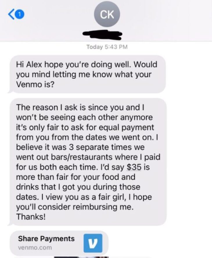«Γεια σου Άλεξ, ελπίζω να είσαι καλά. Θα σε πείραζε να μου πεις ποιο είναι το Venmo (σ.σ. εφαρμογή online πληρωμών για κινητά) σου; Ο λόγος που σου το ζητώ είναι επειδή εσύ και εγώ δεν θα βλεπόμαστε πια, είναι δίκαιο να αξιώνω να μοιραστούμε τα έξοδα από τις φορές που βγήκαμε. Πιστεύω ότι συνολικά ήταν τρεις φορές που πήγαμε σε μπαρ και εστιατόρια, όπου πλήρωσα και για τους δυο μας κάθε φορά. Θα έλεγα ότι τα 35 δολάρια είναι κάτι περισσότερο από δίκαια για το φαγητό και τα ποτά που πήραμε κατά τη διάρκεια αυτών των ραντεβού. Θεωρώ ότι ως ένα δίκαιο κορίτσι, θα σκεφτείς να μου επιστρέψεις τα χρήματα. Ευχαριστώ!».