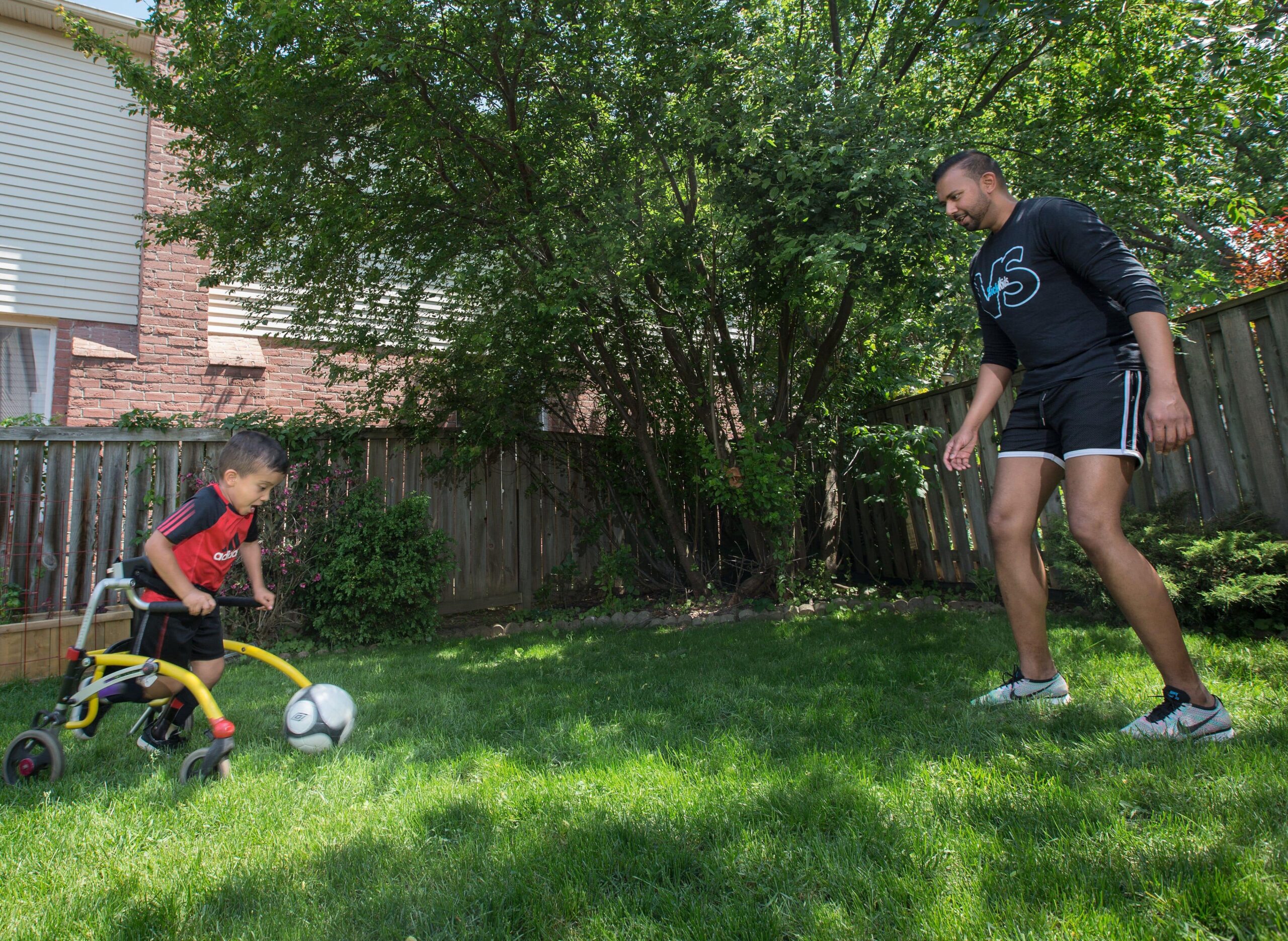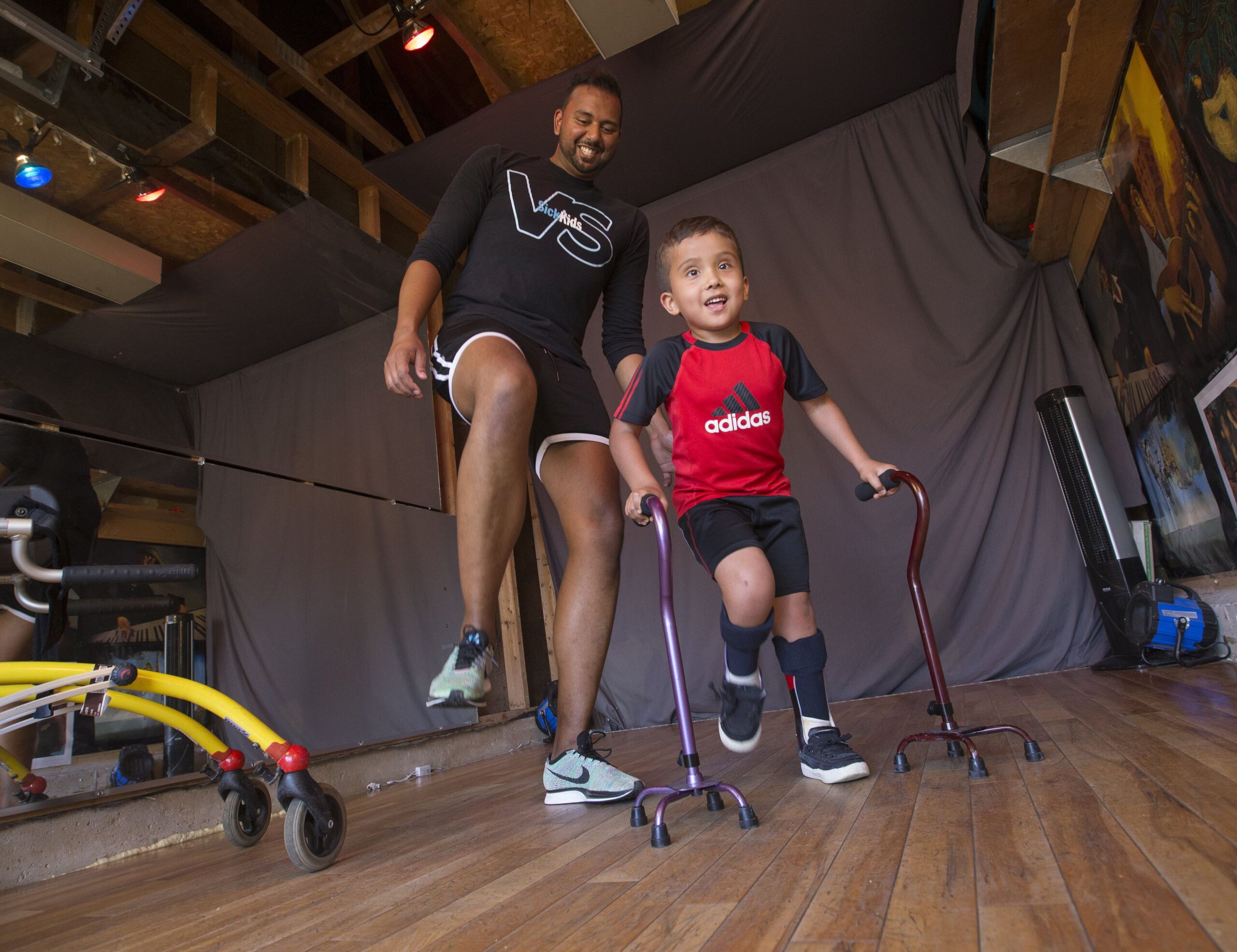 Ο πατέρας του μικρού του έφτιαξε ειδικά παπούτσια που έμπαιναν πάνω απ’ τα μεταλλικά στηρίγματα των ποδιών του κι έχουν σόλα ειδική για κλακέτες. Ο μικρός τρελάθηκε από τη χαρά του, όταν τα φόρεσε για πρώτη φορά και άκουσε τους ήχους που έκανε. Από τότε, έχει μάθει μερικές βασικές φιγούρες για να συνοδεύει τον μπαμπά και τις αδερφές του.