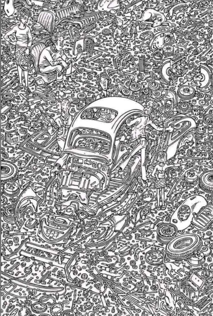 Με την πρώτη ματιά, η σκηνή αυτή μπορεί να φαίνεται υπερβολικά φορτωμένη. Η εικόνα περιλαμβάνει ποικιλία ανταλλακτικών — τροχοί, λάστιχα, μπουλόνια, βίδες, κινητήρες και άλλα — απλωμένα σε μεγάλη έκταση. Μερικοί άνθρωποι συνεχίζουν τις δουλειές τους, αδιάφοροι για το χάος γύρω τους. Όμως, μέσα σε αυτόν τον λαβύρινθο των ανταλλακτικών κρύβονται αντικείμενα, ζώα και ακόμα και ανθρώπινες φιγούρες που δεν είναι άμεσα ορατές στον αμύητο παρατηρητή. Ο στόχος είναι να βρεις αυτά τα κρυμμένα στοιχεία, δοκιμάζοντας την προσοχή σου στη λεπτομέρεια και τις ικανότητες επίλυσης προβλημάτων.