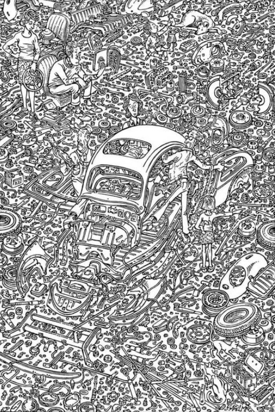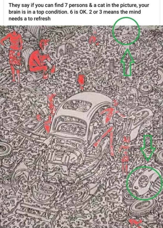 Το ζητούμενο στην παρακάτω ασπρόμαυρη εικόνα είναι ο εντοπισμός 7 ανθρώπων και μίας γάτας, οι οποίοι είναι κάπου «μπλεγμένοι» στο ασπρόμαυρο σχέδιο. Αν καταφέρεις να βρεις τους 7 ανθρώπους και τη 1 γάτα, τότε όλα δουλεύουν «ρολόι» και είσαι πολύ παρατηρητικός.