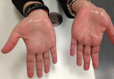 Με πιο απλά λόγια εκεί που κάποιος άλλος άνθρωπος θα ιδρώσει λίγο ή και καθόλου, ένα άτομο με ιδιοπαθή υπεριδρωσία θα γίνει “μούσκεμα”! Εμφανίζεται συμμετρικά στο σώμα (παλάμες – πέλματα – μασχάλες – πρόσωπο – κορμός) σε αυξημένη θερμοκρασία περιβάλλοντος ή σώματος (π.χ. κατά την γυμναστική) καθώς και στο συναισθηματικό στρες. Στο στρες μάλιστα η υπεριδρωσία προτιμά τις παλάμες και τα πέλματα ενώ γενικά ελαττώνεται κατά τον ύπνο.