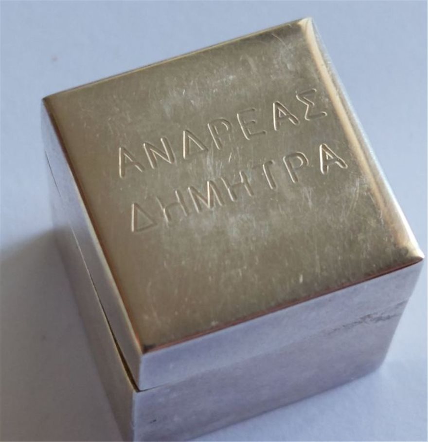 Η ασημένια μπομπονιέρα που μοιάζει με κουτί φέρει στο επάνω της μέρος σκαλιστά τα ονόματα των νιόπαντρων «Ανδρέας – Δήμητρα», ενώ στο εσωτερικό του υπάρχει η σφραγίδα του διάσημου οίκου στο Κολωνάκι.