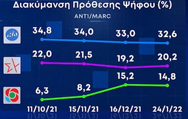 Μεγαλώνει η “ψαλίδα” ανάμεσα σε ΝΔ και ΣΥΡΙΖΑ στην εκτίμηση ψήφου στη δημοσκόπηση Marc
