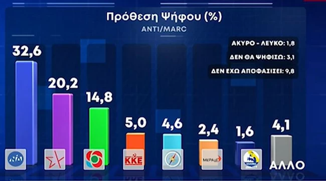 Σύμφωνα με τα στοιχεία του πρώτου μέρους της έρευνας, που παρουσίασε ο διευθύνων σύμβουλος της MARC, Θωμάς Γεράκης, στο κεντρικό δελτίο ειδήσεων του ΑΝΤ1, στην πρόθεση ψήφου τα κόμματα συγκεντρώνουν: