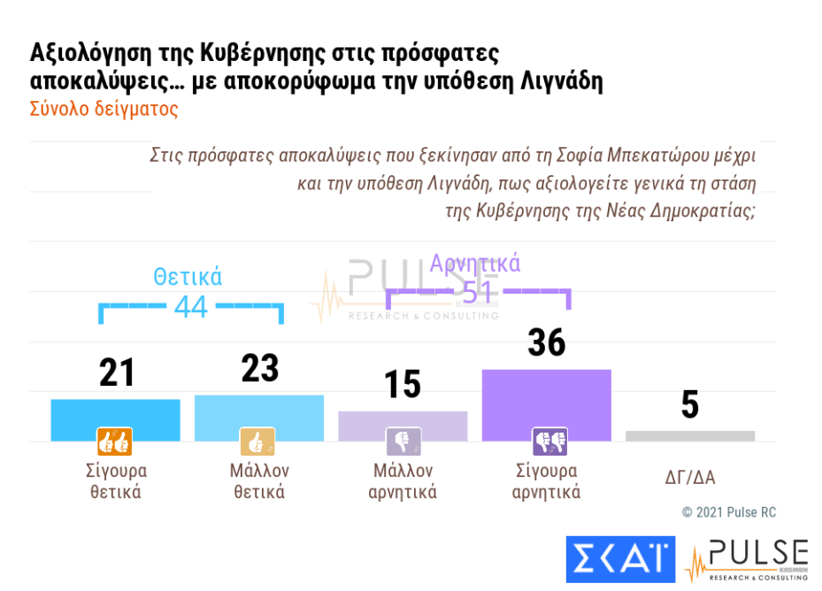 Συγκεκριμένα, πάνω από τους μισούς (51%) αξιολογούν αρνητικά την στάση της κυβέρνησης και της Νέας Δημοκρατίας στις πρόσφατες αποκαλύψεις που ξεκίνησαν από τη Σοφία Μπεκατώρου και με αποκορύφωμα την υπόθεση του Δημήτρη Λιγνάδη.