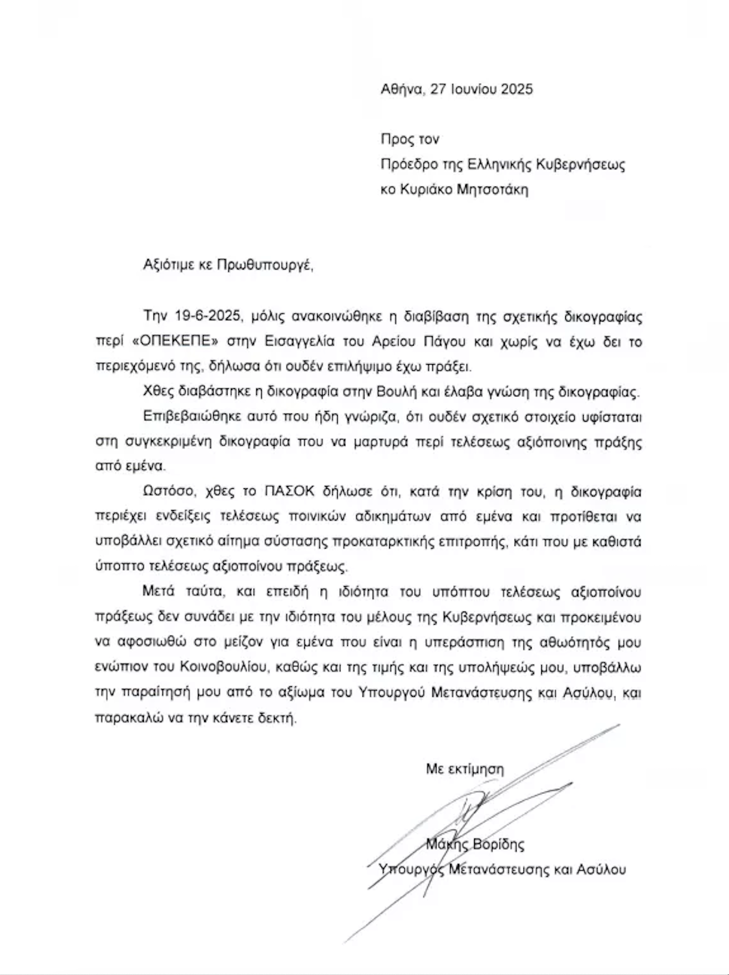 Ανακοινώνεται ότι ο Υπουργός Μετανάστευσης και Ασύλου Μάκης Βορίδης υπέβαλε την παραίτησή του στον Πρωθυπουργό, για τους λόγους που αναφέρονται στην επιστολή και η οποία επισυνάπτεται. Ο Πρωθυπουργός έκανε δεκτή την παραίτησή του.