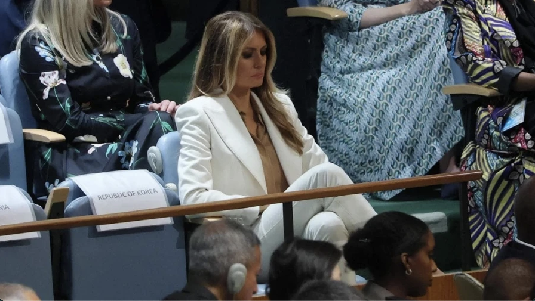 Στην ομιλία του, ο Ντόναλντ Τραμπ επαίνεσε τη σύζυγό του, Μελάνια, η οποία καθόταν στα έδρανα της αμερικανικής αντιπροσωπείας.