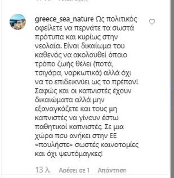 «Ως πολιτικός οφείλετε να περνάτε τα σωστά πρότυπα και κυρίως στην νεολαία. Είναι δικαίωμα του καθενός να ακολουθεί όποιο τρόπο ζωής θέλει (ποτά, τσιγάρα, ναρκωτικά) αλλά όχι να το επιδεικνύει ως το πρέπον! Σαφώς και οι καπνιστές έχουν δικαιώματα αλλά μην εξαναγκάζετε και τους μη καπνιστές να γίνουν έστω παθητικοί καπνιστές. Σε μια χώρα που ανήκει στην ΕΕ «πουλήστε» σωστές καινοτομίες και όχι ψευτόμαγκες!»