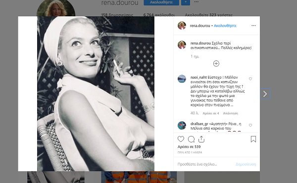 Η Ρένα Δούρου άδραξε την ευκαιρία να προχωρήσει σε μία ανάρτηση στα μέσα κοινωνικής δικτύωσης. Η πρώην περιφερειάρχης Αττικής ανάρτησε στον προσωπικό λογαριασμό που διατηρεί και διαχειρίζεται η ίδια στο Instagram, μια ανάρτηση, η οποία προκάλεσε ποικίλες αντιδράσεις. Στην ανάρτησή της, η Ρένα Δούρου έχει ανεβάσει ως λεζάντα το εξής: «Σχόλιο περί αντικαπνιστικού… Πολλές καλημέρες!». Μάλιστα, η συγκεκριμένη ανάρτηση συνοδεύεται κι από φωτογραφία της Μελίνας Μερκούρη.