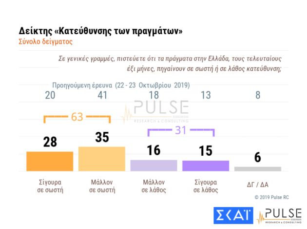 Η κοινή γνώμη δείχνει αισιόδοξη για την πορεία των πραγμάτων, καθώς το 63% πιστεύει ότι τα πράγματα στην Ελλάδα πηγαίνουν προς τη σωστή κατεύθυνση τους τελευταίους έξι μήνες.
