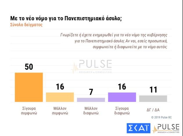 Όσον αφορά τον νέο νόμο για το πανεπιστημιακό άσυλο, το 66% συμφωνεί έναντι του 23% που δηλώνει ότι διαφωνεί.