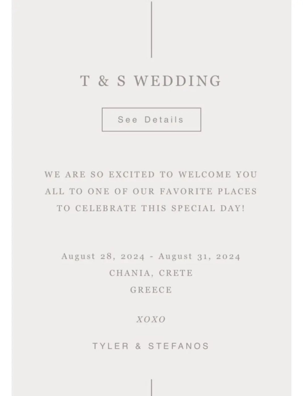 «Είμαστε τόσο ενθουσιασμένοι που προσκαλούμε όλους εσάς σε ένα από τα πιο αγαπημένα μας μέρη για να γιορτάσουμε αυτή την ιδιαίτερη ημέρα!» αναφέρει το ζευγάρι στο ηλεκτρονικό προσκλητήριο.
