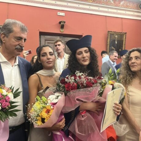 Η οικογένεια Πολάκη, γνωστή στην τοπική κοινωνία των Χανίων, είχε κάθε λόγο να γιορτάζει, με τον Παύλο Πολάκη να παρακολουθεί με καμάρι την κόρη του να ανοίγει τα δικά της επιστημονικά φτερά στον χώρο της Ιατρικής.