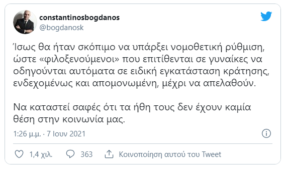 “Ίσως θα ήταν σκόπιμο να υπάρξει νομοθετική ρύθμιση, ώστε “φιλοξενούμενοι” που επιτίθενται σε γυναίκες να οδηγούνται αυτόματα σε ειδική εγκατάσταση κράτησης, ενδεχομένως και απομονωμένη, μέχρι να απελαθούν. Να καταστεί σαφές ότι τα ήθη τους δεν έχουν καμία θέση στην κοινωνία μας”, ανέφερε χαρακτηριστικά στην ανάρτησή του ο κ. Μπογδάνος.