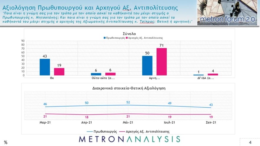 Στη δε αξιολόγηση του Κυριάκου Μητσοτάκη ως πρωθυπουργού, το 43% τον κρίνει θετικά, με το 50% να λέει αρνητικά, αλλά τα αντίστοιχα για τον Αλέξη Τσίπρα ως προς την απόδοσή του από τη θέση του αρχηγού της αξιωματικής αντιπολίτευσης είναι απογοητευτικά: Το 19% τον κρίνει θετικά, με το 71% να λέει αρνητικά.