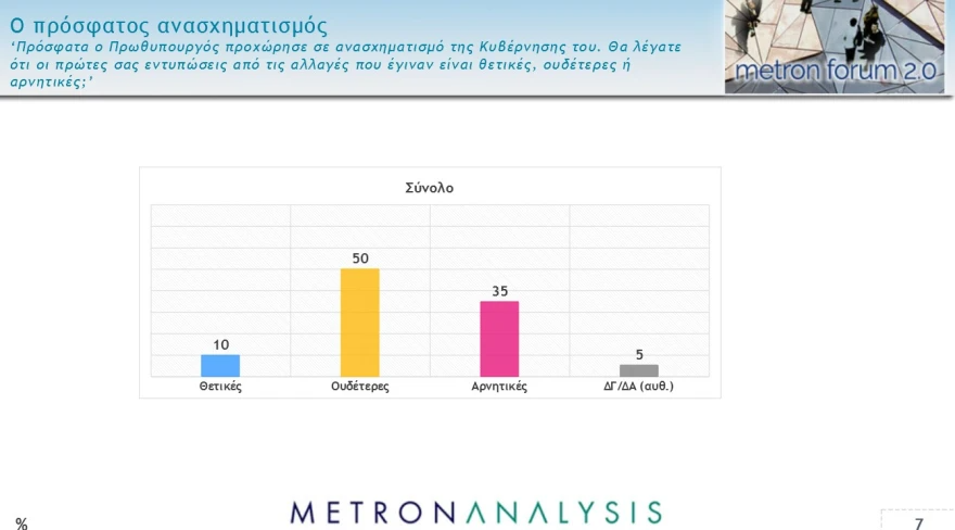 Αλλά και οι εντυπώσεις για τον ανασχηματισμό δίνουν αρνητικό ισοζύγιο για την κυβέρνηση. Ποσοστό 35% εκφράζεται αρνητικά, μόλις 10% θετικά, ενώ το 50% δηλώνει ουδέτερο.