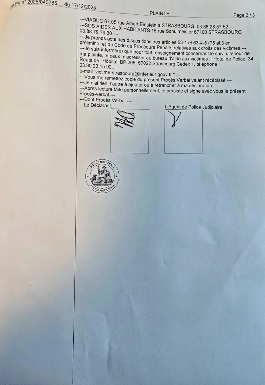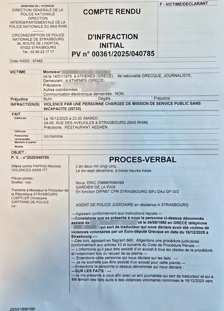 Το πρωί της Τετάρτης 17 Δεκεμβρίου 2025, ο Νίκος Γιαννόπουλος κατέθεσε μήνυση στην Αστυνομική Διοίκηση Αλσατίας στο Στρασβούργο, περιγράφοντας αναλυτικά το περιστατικό.