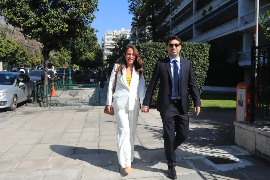 Η εγκυμονούσα Δόμνα Μιχαηλίδου με τον σύζυγό της, Λεωνίδα Μαντωνάκη. Η πολιτικός αναλαμβάνει το τιμόνι του Υπουργείου Κοινωνικής Συνοχής και Οικογένειας.