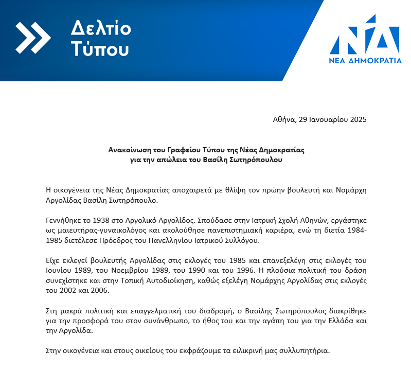 Η Νέα Δημοκρατία εξέφρασε τη θλίψη της για την απώλεια του Βασίλη Σωτηρόπουλου, με ανακοίνωση που τιμά τη ζωή και το έργο του: