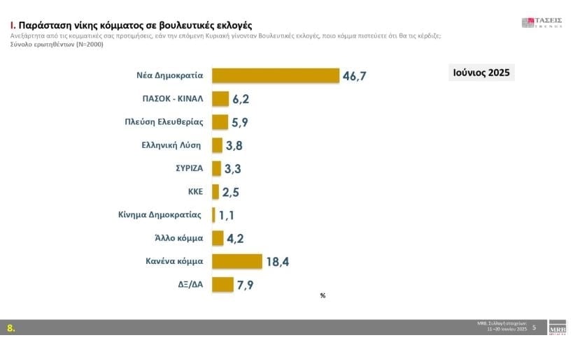 Οι δημοσκοπικές τάσεις της MRB δεν επιτρέπουν πανηγυρισμούς σε κανένα κόμμα και σε κανέναν πολιτικό αρχηγό, καθώς ο φόβος, η οργή και η απογοήτευση κρατούν τα ποσοστά όλων χαμηλά, επιβεβαιώνοντας μια γενικευμένη κρίση πολιτικής εμπιστοσύνης και αντιπροσώπευσης.