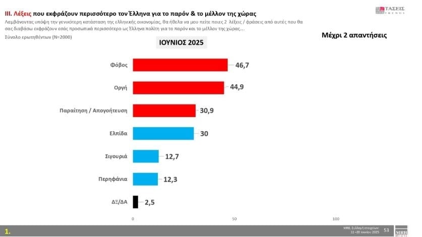 Η λέξη «φόβος» με ποσοστό 46,7 % εκφράζει περισσότερο τους πολίτες για το παρόν και το μέλλον της χώρας, ακολουθούν η «οργή» με 44,9% και η «παραίτηση/απογοήτευση» με 30,9%.