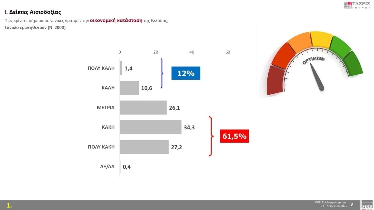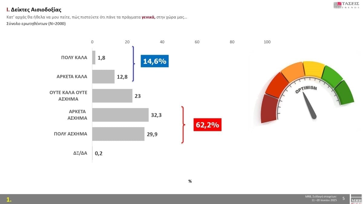 Αντίστοιχα, οι πολίτες δηλώνουν σε συντριπτικό ποσοστό ότι η κατάσταση στη χώρα πηγαίνει «πολύ άσχημα» ή «αρκετά άσχημα» (62,2%), ενώ μόλις 14,6% βλέπουν κάτι θετικό.