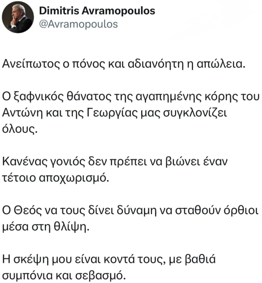 «Ο ξαφνικός θάνατος της αγαπημένης κόρης του Αντώνη και της Γεωργίας μας συγκλονίζει όλους» ανέφερε από την πλευρά του ο βουλευτής της ΝΔ, Δημήτρης Αβραμόπουλος και πρόσθεσε: «Ανείπωτος ο πόνος και αδιανόητη η απώλεια. Ο ξαφνικός θάνατος της αγαπημένης κόρης του Αντώνη και της Γεωργίας μας συγκλονίζει όλους. Κανένας γονιός δεν πρέπει να βιώνει έναν τέτοιο αποχωρισμό. Ο Θεός να τους δίνει δύναμη να σταθούν όρθιοι μέσα στη θλίψη. Η σκέψη μου είναι κοντά τους, με βαθιά συμπόνια και σεβασμό».