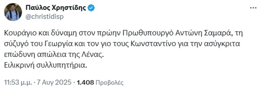 Ο κοινοβουλευτικός εκπρόσωπος του ΠΑΣΟΚ Παύλος Χρηστίδης σημείωσε: «Κουράγιο και δύναμη στον πρώην Πρωθυπουργό Αντώνη Σαμαρά, τη σύζυγό του Γεωργία και τον γιο τους Κωνσταντίνο για την ασύγκριτα επώδυνη απώλεια της Λένας. Ειλικρινή συλλυπητήρια».
