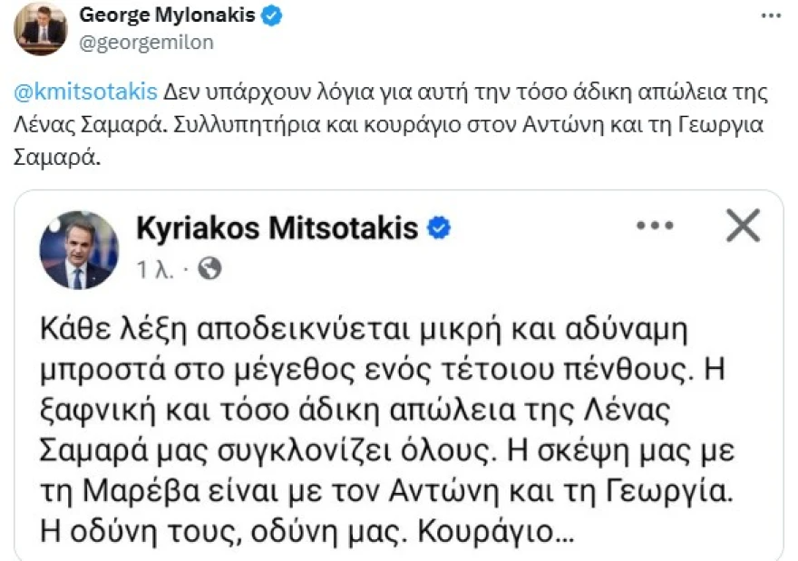 Ο υφυπουργός στον πρωθυπουργό Γιώργος Μυλωνάκης έγραψε: «Δεν υπάρχουν λόγια για αυτή την τόσο άδικη απώλεια της Λένας Σαμαρά. Συλλυπητήρια και κουράγιο στον Αντώνη και τη Γεωργια Σαμαρά».