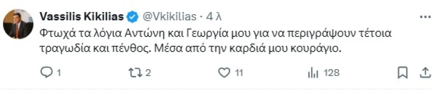 «Φτωχά τα λόγια Αντώνη και Γεωργία μου για να περιγράψουν τέτοια τραγωδία και πένθος. Μέσα από την καρδιά μου κουράγιο» έγραψε σε ανάρτησή του ο υπουργός Ναυτιλίας, Βασίλης Κικίλιας.