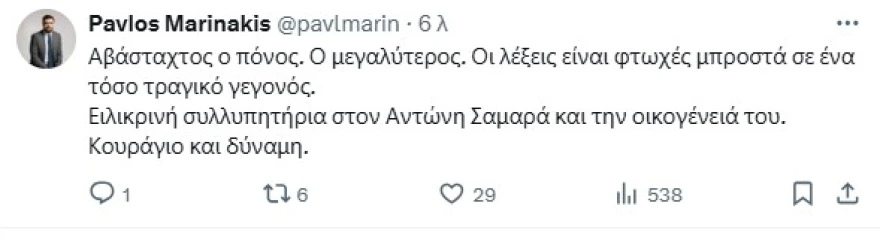 Τα συλλυπητήριά του εξέφρασε και ο κυβερνητικός εκπρόσωπος, Παύλος Μαρινάκης: «Αβάσταχτος ο πόνος. Ο μεγαλύτερος. Οι λέξεις είναι φτωχές μπροστά σε ένα τόσο τραγικό γεγονός. Ειλικρινή συλλυπητήρια στον Αντώνη Σαμαρά και την οικογένειά του. Κουράγιο και δύναμη».