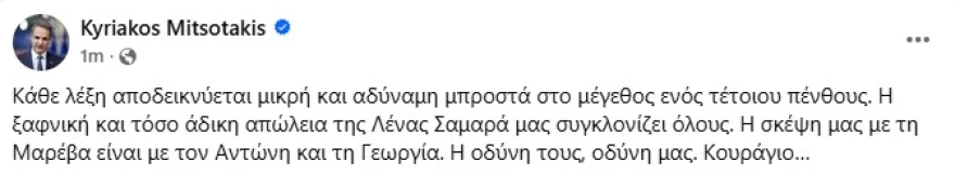 Με μία ιδιαίτερα φορτισμένη συναισθηματικά ανάρτηση, ο πρωθυπουργός Κυριάκος Μητσοτάκης εξέφρασε τη θλίψη του για τον θάνατο της Λένας Σαμαρά: «Κάθε λέξη αποδεικνύεται μικρή και αδύναμη μπροστά στο μέγεθος ενός τέτοιου πένθους» ανέφερε χαρακτηριστικά στην ανάρτησή του και πρόσθεσε: «Η ξαφνική και τόσο άδικη απώλεια της Λένας Σαμαρά μας συγκλονίζει όλους. Η σκέψη μας με τη Μαρέβα είναι με τον Αντώνη και τη Γεωργία. Η οδύνη τους, οδύνη μας. Κουράγιο…».