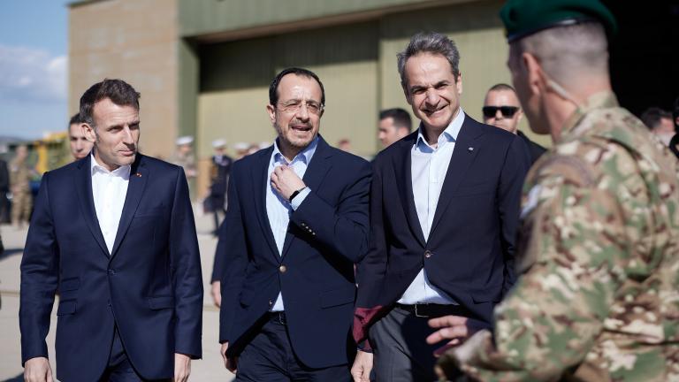 Η επίσκεψη του Εμανουέλ Μακρόν γίνεται μετά την τριμερή συνάντησή του με τους Κυριάκο Μητσοτάκη και Νίκο Χριστοδουλίδη στην αεροπορική βάση «Ανδρέας Παπανδρέου» στην Πάφο.