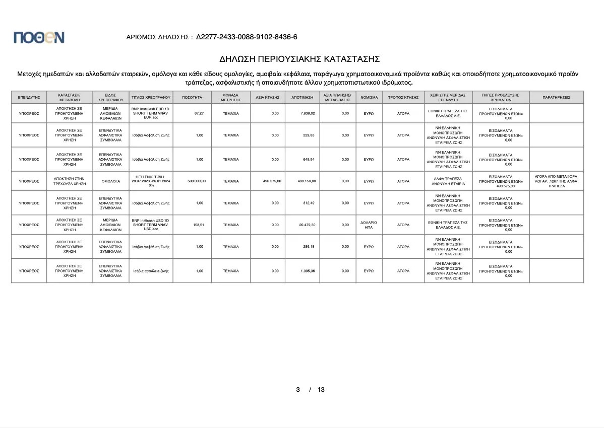 Επένδυσε 498.150 ευρώ σε κρατικά ομόλογα, ενώ οι καταθέσεις του μειώθηκαν σε 110.668,46 ευρώ. Διατήρησε τα ίδια ακίνητα, τα δύο ΙΧ και το μερίδιό του στον «ΚΗΡΥΞ ΑΕ». Οι οφειλές του διαμορφώθηκαν σε 10.560 ευρώ σε κάρτα και 150.000 ευρώ προς την αδελφή του.